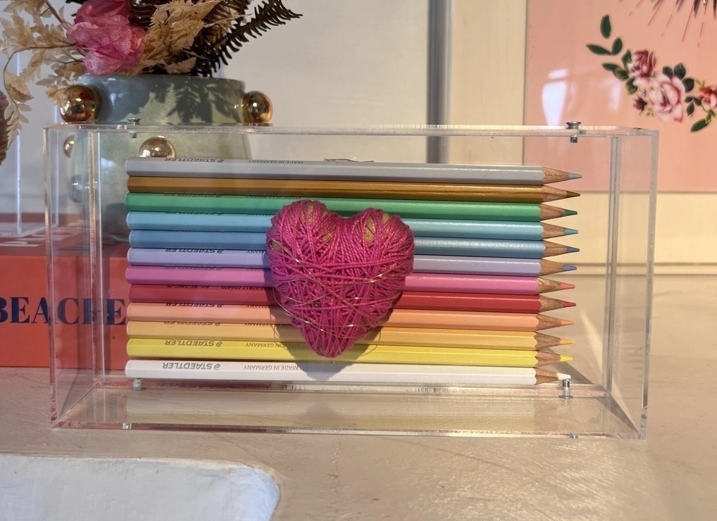 Caixa de Acrílico com Lápis de Cor e Coração Entrelaçado - 10cm x 20cm x 4cm