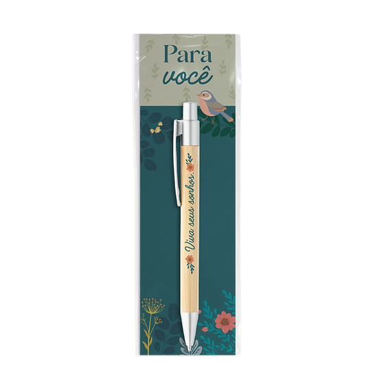 Card com mensagem + Caneta esferográfica em bambu com clipe metálico | cor da escrita: azul