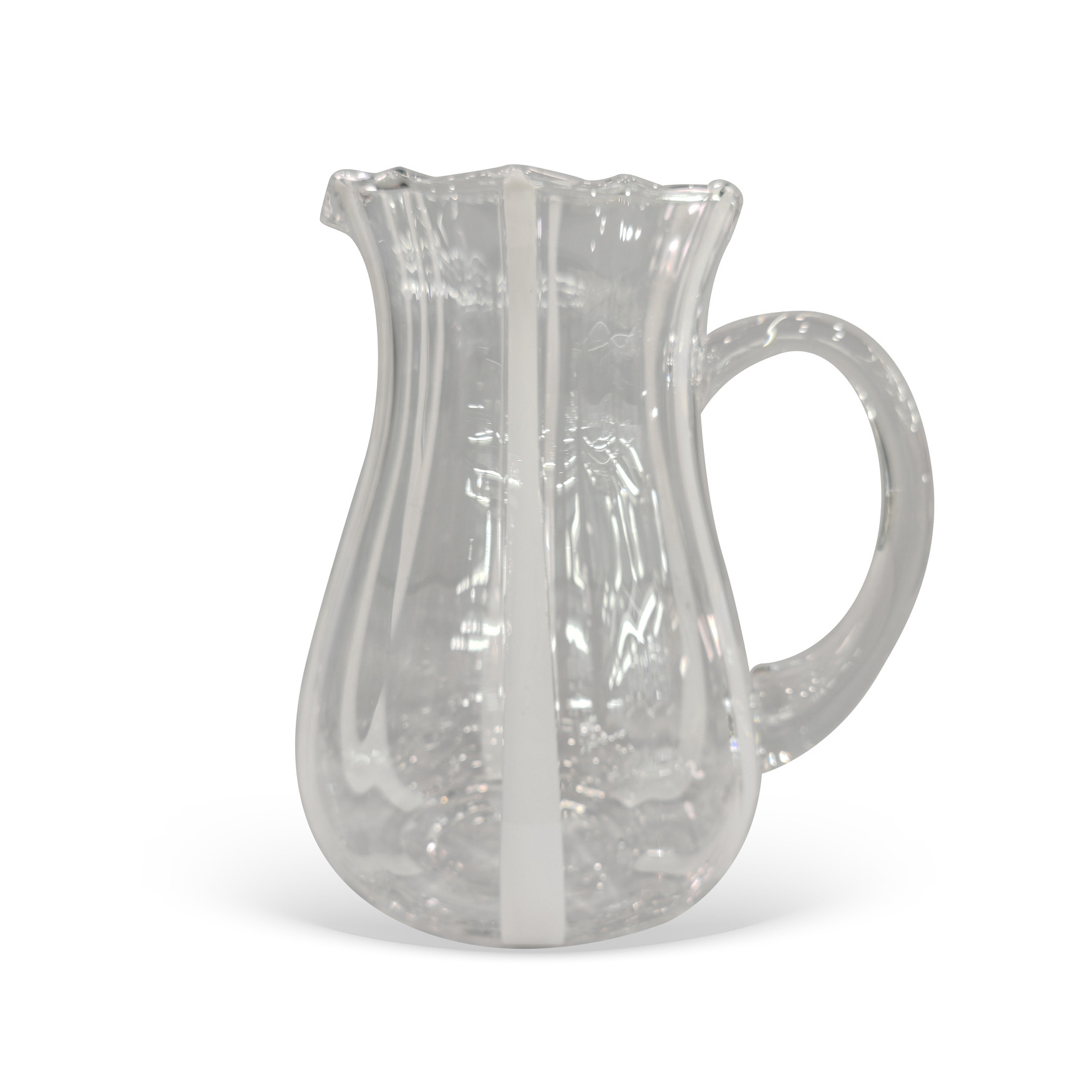 Borda Ondulada: A borda superior da jarra possui um acabamento ondulado e irregular, característico de peças de vidro artesanal ou soprado.