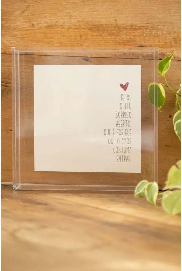 Uma peça sofisticada, com moldura em acrílico transparente. Esta obra destaca uma arte impressa em papel e um pequeno coração vermelho. A composição é um convite à leveza e à abertura para o afeto um lembrete sensível de que o amor começa nos gestos mais simples.