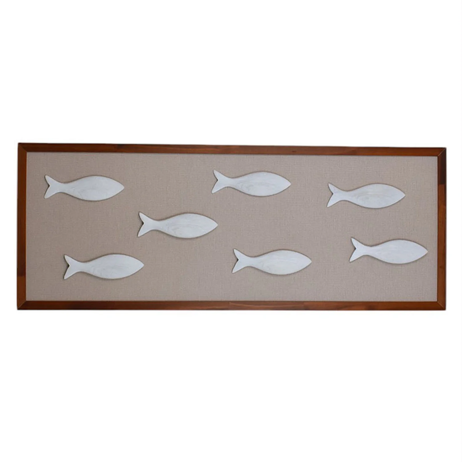 Quadro decorativo com temática náutica, composto por peixes brancos em relevo sobre fundo neutro e moldura em madeira. Um toque artesanal e leve para ambientes com estilo praiano ou rústico-chique. Ideal para compor paredes de salas, varandas ou lavabos.