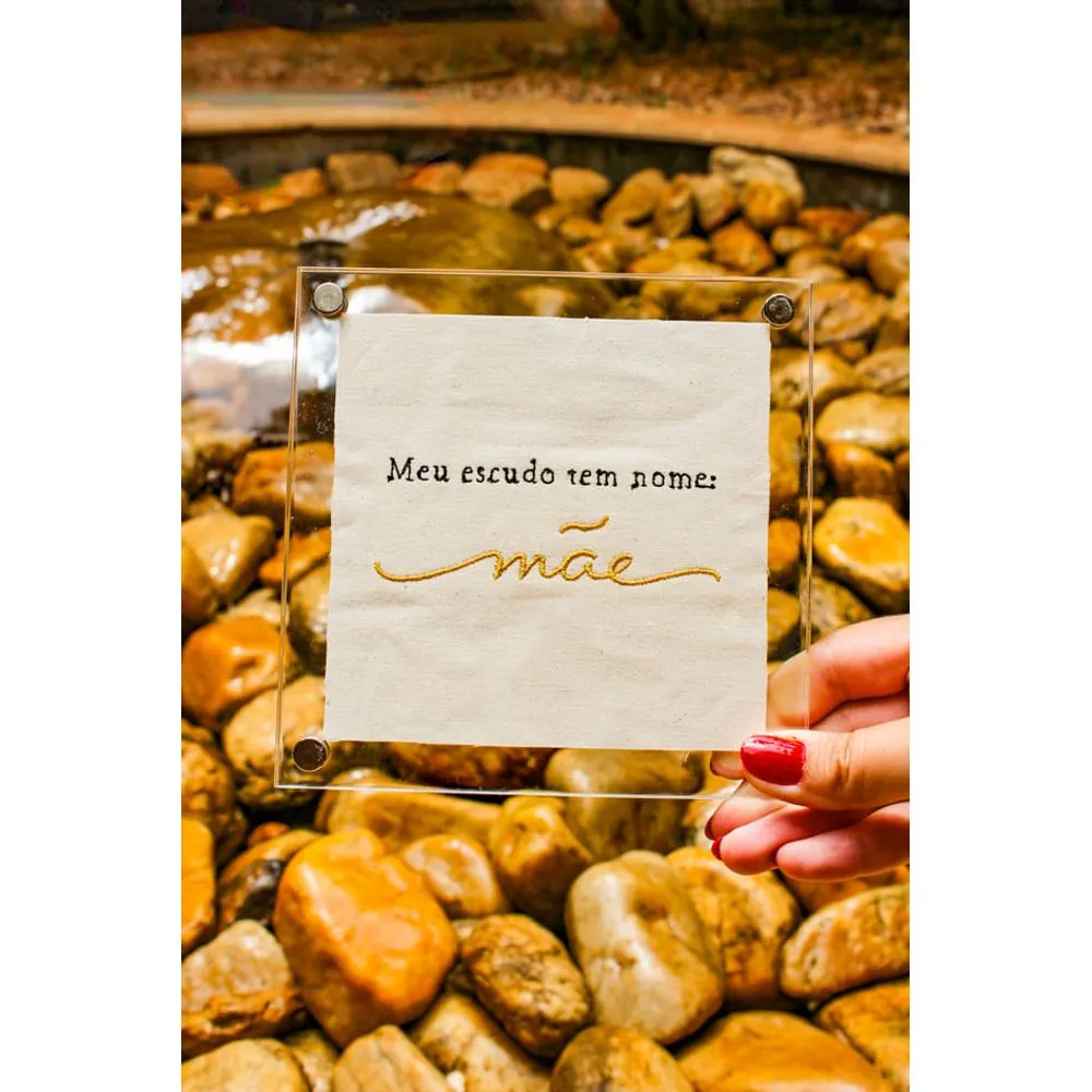 Quadro em acrílico bordado com a frase (Meu escudo tem nome: mãe). Uma peça sofisticada, com moldura em acrílico transparente, que valoriza a delicadeza do linho e a força da mensagem bordada. A peça que traz textura e afeto para a composição, transformando o amor materno em um símbolo de proteção e significado. O mimo mais que especial para homenagear mães que representam amparo, coragem e abrigo em todos os momentos.