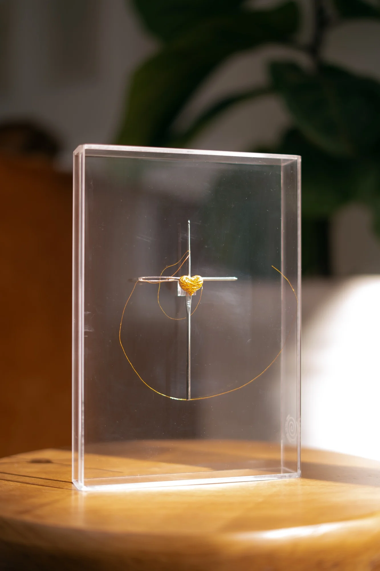 A cruz que faz morada no seu coração flutua, é leve, e foi costurada com um fio sutil que estabelece a conexão entre o que há de mais belo na essência humana e Deus. Como um fio invisível que nos sustenta, a obra traduz o amor puro, a beleza do sagrado, o acolhimento. Ela descreve as palavras que movem o mundo. AMOR e PAZ.