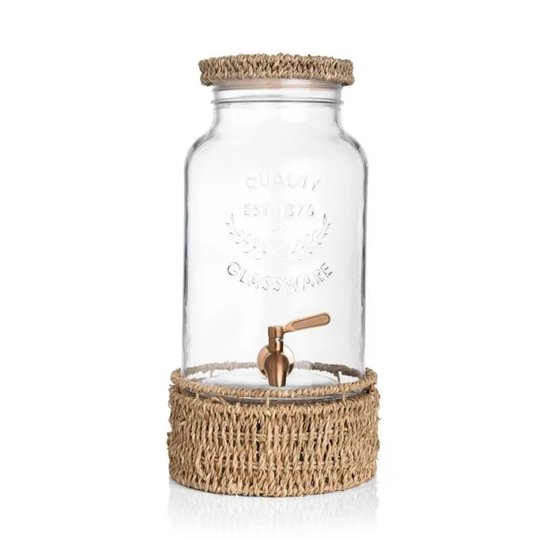 A tampa em madeira revestida com as fibras naturais, fechamento hermético, o corpo transparente e os detalhes em cobre da válvula de abertura, capacidade para 5,750l são perfeitos e combinam com diversas decorações.